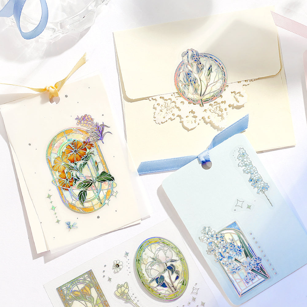 Add a touch of ethereal beauty to your creations with the BGM Foil Stamping Iride Seal – Iride: Stained. Inspired by the shimmering hues of stained glass, this set of elegant stickers features a radiant aurora foil effect that reflects light with every angle, making it perfect for journals, planners, gift wraps, and more.